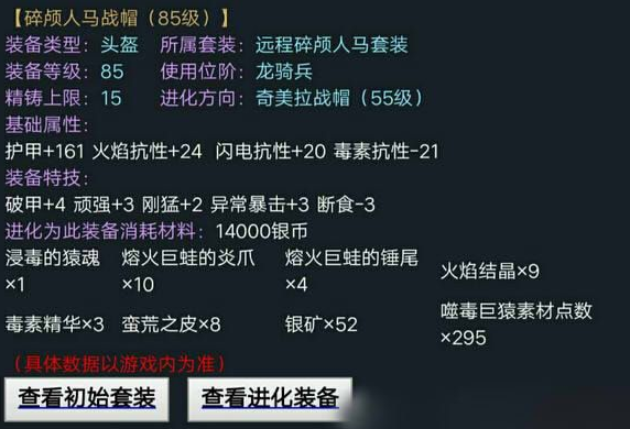 进化为此装备消耗材料:14000银币浸毒的猿魂x1 熔火巨蛙的炎爪x10 火焰结晶x9 毒素精华x3 蛮荒之皮x8 银矿x52 巨猿素材x295