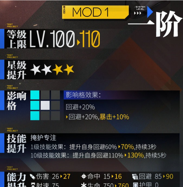 升级至MODⅠ:提升星级,等级上限提升至110,誓约人形获取经验速度提升为2倍。(心智升级后的誓约人形通过报告书获得经验也为2倍,目前赠送报告书时获得经验和升至等级存在显示错误的问题,但并不影响实际获得经验、实际消耗报告书数量及实际升至等级。对心智升级后的誓约人形赠送报告书后会被要求重新登录以刷新正确的等级、经验和报告书存量,该问题将在下个非强更版本中修复。)