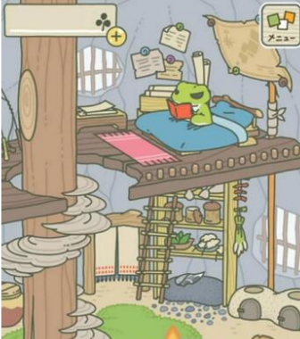 玩家在这个游戏里大多数时间处于“无所事事”状态,我们每隔一段时间开游戏看看,屋外的幸运草长满了就去拔一拔,收获的幸运草可以拿来购买各种便当、碗具、水壶、灯笼等道具,这些都是可以给小青蛙出门带着的。小青蛙的包袱里一般放便当、护身符、道具。便当就不用说了,路上的口粮,护身符是保佑出行平安的,道具可以是水壶、碗器、灯笼等等实用的东西,这些东西越好,小青蛙就可以走得越远,看到更多的风景。