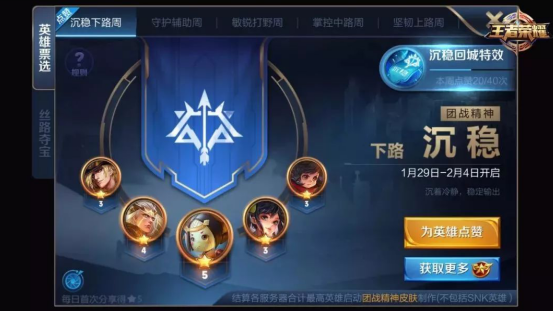 王者荣耀团战精神皮肤分为下路,辅助,打野,中路和上单5个英雄,通过玩家的投票选择5个英雄制作团战精神专属皮肤,那么王者荣耀团战精神皮肤怎么获得,下面带来王者荣耀团战精神皮肤获得方法攻略,希望对大家有所帮助。