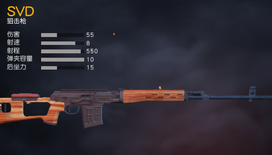 svd狙击枪的有点事射速快,射程远,弹夹容量还不错,但是缺点就是伤害比较低。不过这也是连狙的基本特性了。