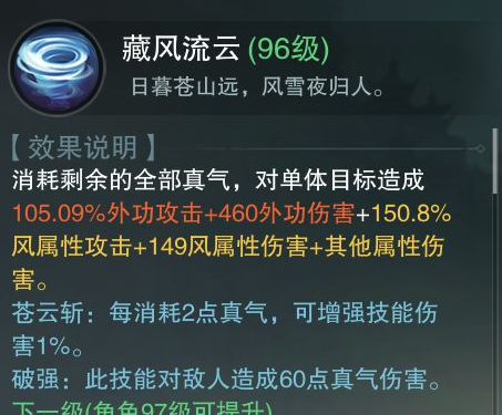 华山的吹风,技能核心中的核心,伤人一千自损八百的技能,由于释放会清空所有真气,所以要非常考虑释放的时机,也是连招必备技能之一。