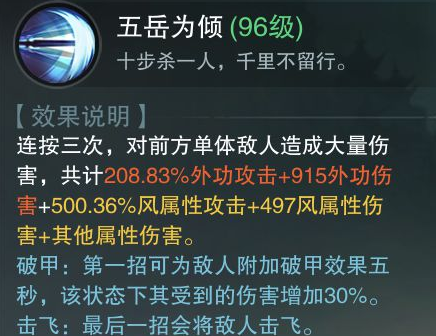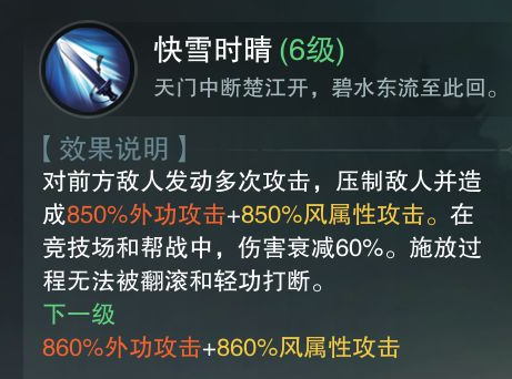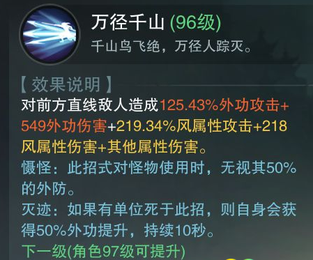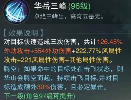 非常牛一个绝学技能,也是非常挫的一个技能。大招前两次直接可以群体挑飞,空中持续攻击不掉下来。绝学需要靠技能和普攻积攒满怒气释放,华山的高爆发注定不会打很久,反正我打那么多场论剑,基本没用出来过,基本也就是打本和多人战场的时候能用出。