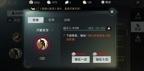 增强轻功技能的伤害、效果,还能降低消耗。而且加的修为还会多。