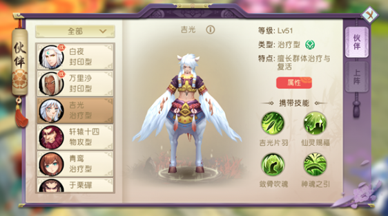 和青鸾一样,同样作为治疗型伙伴之一的吉光,特点是擅长群体治疗与复活。吉光是上古神兽一族,生活在北地大泽之中,浑身雪白,并长有白色的羽毛。他们的羽毛非常珍贵,有“吉光片羽”之说。性格活泼,热血冲动,与秦玉相识于漠北,一同经历过奇异的冒险从而成为了很好的伙伴,秦玉南下中原也自告奋勇一路跟随前往。