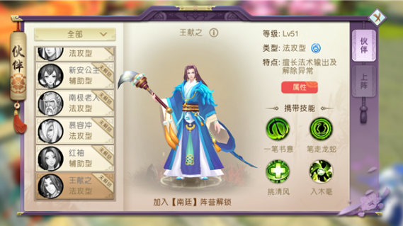 王献之作为法攻型的伙伴之一,特点是擅长法术输出,并且可以解除异常。