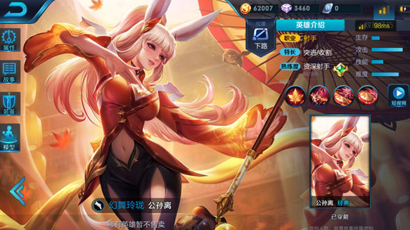 公孙离适合的位置是打野,打野的自由度能把公孙离的高机动性发挥到最大,野区各种墙也能让公孙离秀到飞起,铭文攻速百穿或者换红月。