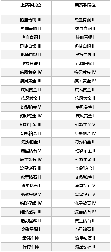 除了车神和星耀段位降低的比较多之外,其他段位都只是减少一到两个小段,所以对于广大玩家还是比较良心的。