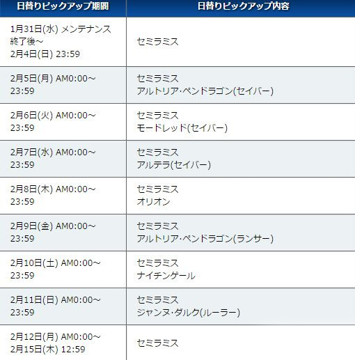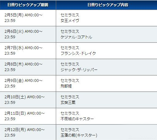 本次的卡池内Pick up的是常驻女性五星与新登场的赛米拉米斯,共有「2018情人节pick up1召唤(日替)」和「2018情人节pick up2召唤(日替)」两个卡池,出现的Servant全部为女性。