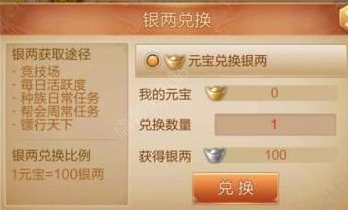 首先我们来科普下银两的用途,银两是主要流通货币之一,既可以在银两商店中进行消费,购买强化露、精炼石、宠物口粮等用以提升战力的道具,又可以在摆摊时购买其他玩家出售的物品。玩家也可以将手中的元宝,以1:100的比例兑换成银两。