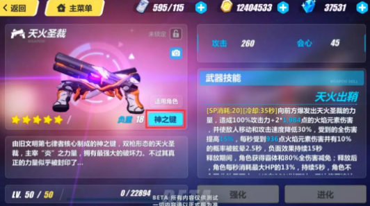 下图中,左侧上方还可以看到详细的神之键功能,该武器的剧情漫画,武器详情。
