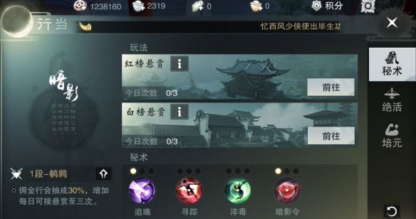 适合人群:喜欢行刺的,想通过悬赏赚点银两的,但是想要赚钱,还是推荐PK实力和修为强,能杀的过排行榜人物的,毕竟普通人头不值钱。