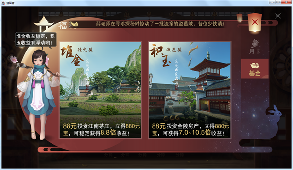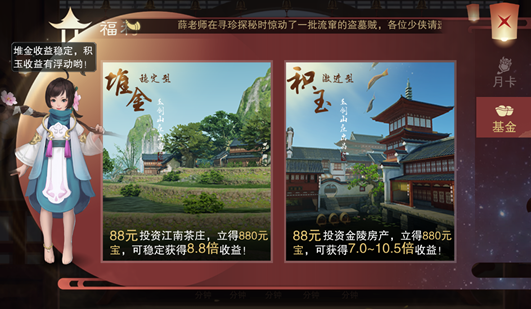 楚留香手游基金哪个好,楚留香手游基金可以选择投资江南茶庄或者金陵房产,一个是稳定得元宝,一个是激进型得元宝,两种基金都只需要88元,那么楚留香手游基金买哪个好,下面带来两种基金性价比选择分析,希望对大家有所帮助。