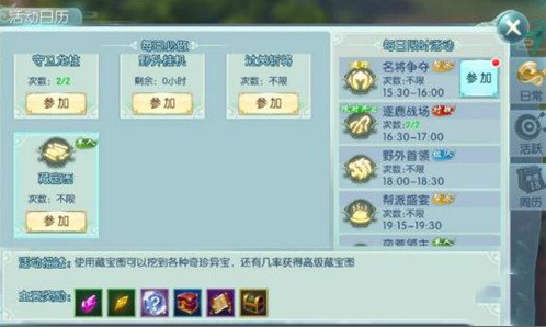 玩家每天可以通过各种日常任务获得藏宝图,宝图任务需要玩家前往指定地点后开启宝图即可获得奖励。点击宝图会自动寻路前往坐标点,使用宝图后自动前往下一宝图的坐标点,直到玩家主动取消或宝图使用完。