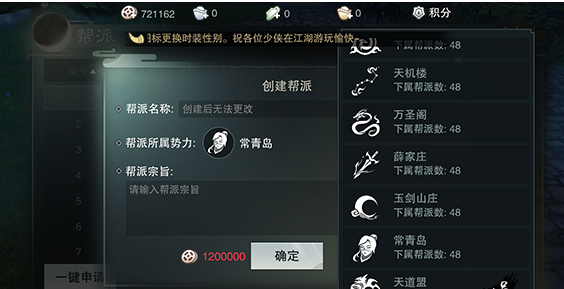 1、创建帮派时,需要选择帮派支持的势力,且1个帮派仅能支持1个势力。