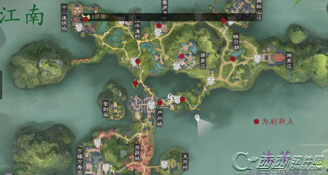 江南有9个位置可以完成坐观万象任务,而且分布得比较近,非常适合玩家在这里找刷新点,其中严州城、映日湖、雪庐书院是比较常见的。