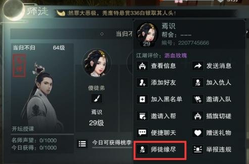 徒弟达到60级后就可以出师了,但是并没有出师功能,只能手动脱离师门,没到60级也可以脱离师门,师傅也可以把徒弟逐出师门。可以花费银子立即脱离,也可以免费24小时后脱离。脱离师门后再拜师目前没有冷却时间,但是连续脱离师门有冷却时间。