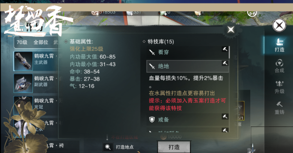 每件装备的右侧的感叹号都会告诉玩家都有什么特技,在什么地点会打造几率高一些