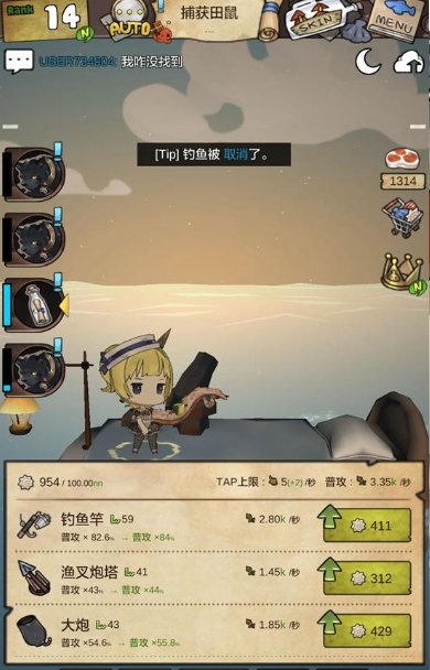 想挂机的肝我教你,1,升级后会给你500药水,升到后面会有炼金炉(没错就是有一只猫在管理那里)选择第二个,然后手机下方有个菜单栏,选择第二个,里面有个自动钓鱼的选项,升满,然后你去钓鱼会发现还是需要手动(因为你钓到的鱼不一样,打个比方,第一次的鱼你钓到42级的需要手动,第二次的鱼如果还是42级不需要你手动了)等你每一个鱼到42级,去任意一个小岛钓就行了,右上角有个月亮图标,点击两下(记住是两下)然后会黑屏,然后手机放旁边就可以睡觉了。第二天碰下手机屏幕就开了,对了,别忘记保存数据哦。还有钩子不要蓄积满,不然钓出来的鱼都要手动