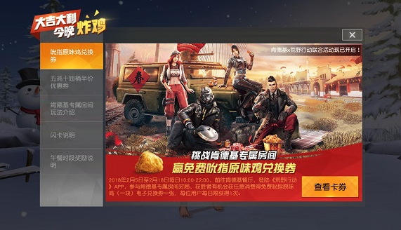 2月5日至2月18日每日10:00到22:00,前往肯德基餐厅, 登录《荒野行动》APP,参与肯德基专属房间对局,获胜者有机会获任意消费的免费吮指原味鸡(一块)电子兑换券一张,每位用户每日仅限一次!