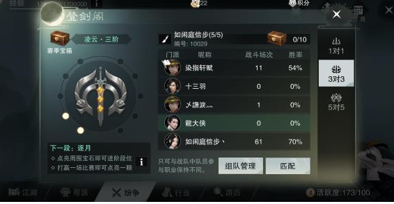 每晚8点到12点开启,每个登剑阁战队可以招收五名队员,目前仅开放的3V3每次匹配必须3个不同职业组队匹配,在登剑阁比赛场会自动按如下方式平衡所有玩家属性: