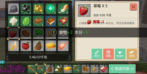 3、做出水袋,然后跑到河边或者海边,将水袋放到快捷栏里面,点击水袋,水分会补充满。
