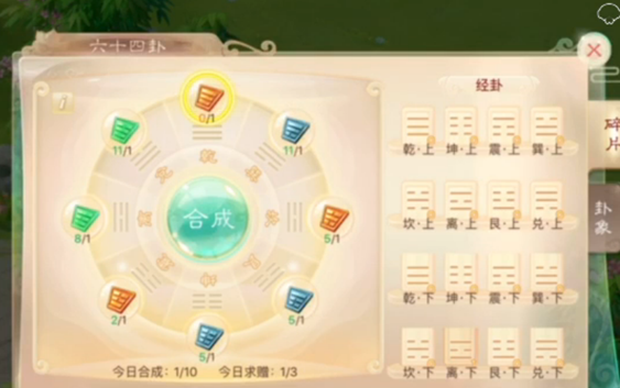2.合成:玩家如果自己有某个经卦的上卦和下卦,那么直接合成就可以了,不过这样自己会消耗2个卦只能获得1个天机锦囊奖励。