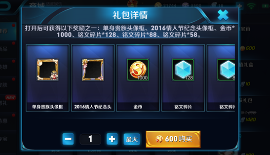 王者荣耀600金币可以购买幸运头像框宝箱,可以开出2016情人节纪念头像框和单身贵族头像框,都是两款节日限定头像框奖励,那么王者荣耀600幸运头像框宝箱值得开吗,600金币宝箱怎么开头像框,下面带来王者荣耀幸运头像框宝箱介绍,希望对大家有所帮助。