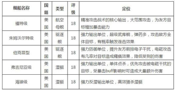 最佳阵容搭配福特级、朱姆沃尔特级伯克中型弗吉尼亚级海狼级该阵容的舰船定位详情如下
