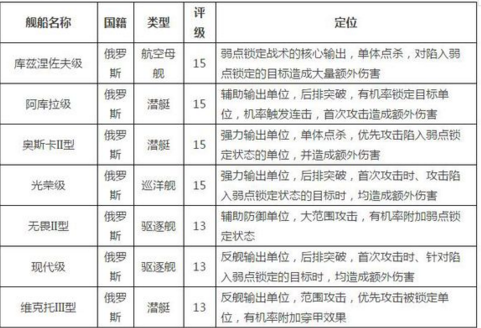 最佳阵容搭配:库兹涅佐夫级、阿库拉级、奥斯卡Ⅱ型、光荣级、无畏Ⅱ型、现代级、维克托3型;该阵容的舰船定位详情如下: