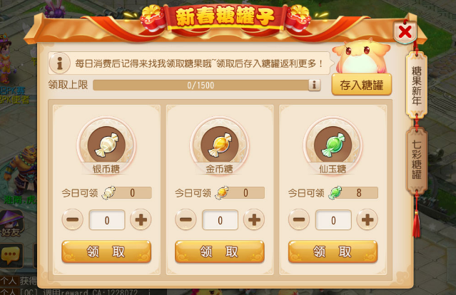 玩家获得的糖果会放入七彩糖罐中,里面拥有的对应糖果数量越多获得的奖励也越多(不包括彩虹糖),三种糖果最多只能领取1500个。注意一下这个活动时间如果结束了,原来罐子里的糖果没办法再按照上述方法获取奖励,比如银币糖用一个给5万银币,每天最多1000次;金币糖一个500金币;