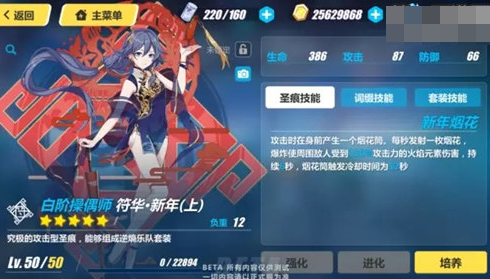 新年烟花:攻击时在身前产生一个烟花筒。每秒发射一枚烟花,爆炸使周围敌人受到150%攻击力的火焰元素伤害,持续6秒,烟花筒触发冷却时间为12秒。