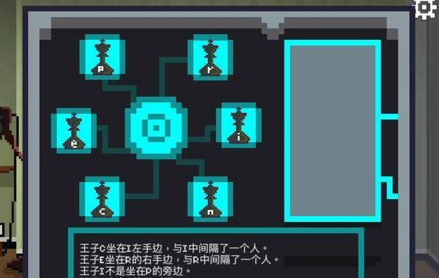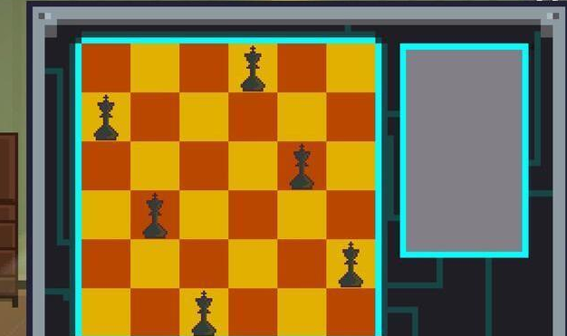 返回大厅,同样触碰机器发生谜题:在棋盘上摆放棋子,满足条件。其中一个解如下图: