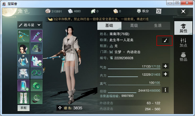 【角色】的页面,在“属性”这一项,“基础”里面点击称谓后面的“笔”。
