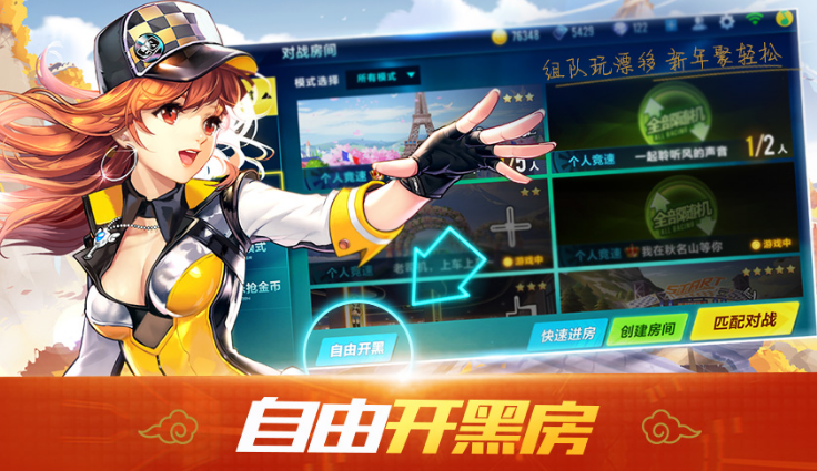 对战房间大厅增设【自由开黑房】入口,在该房间内,好友之间可以随时随地自由开局,不受等级、驾照的限制;