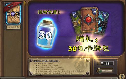 限时促销活动,你能够以优惠价购买到30点奥术之尘,获赠内含30包卡牌包的合集——“勇闯安戈洛”、“冰封王座的骑士”以及“狗头人与地下世界”各10包卡牌包。