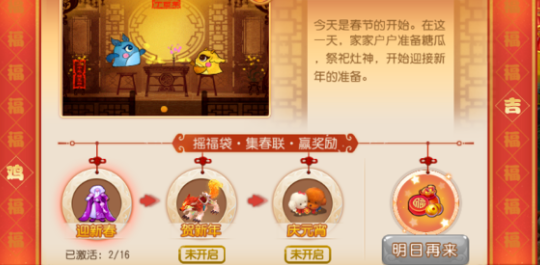 正常情况下玩家每天只能激活一次春联文字(通过摇动福袋来点亮春联文字),如果玩家当天没有摇福袋会转化为1点福气值,下次可以消耗1福气+10万银币再摇一次,所以活动期间有忘记摇福袋的情况也不需要担心,只是要额外花费银币摇动。