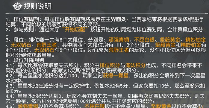 2.一共有几个段位:6个大段位(顽强青铜、不屈白银、坚毅黄金、精妙铂金、无双钻石、荒野王者)每个大段位还有相应的小段位。详情可以看下图↓