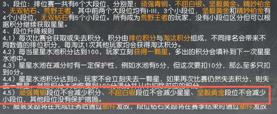 顽强青铜段位不会减少积分,不屈白银段位不会减少星星,坚毅黄金段位不会减少小段位,其他段位没有保护机制。