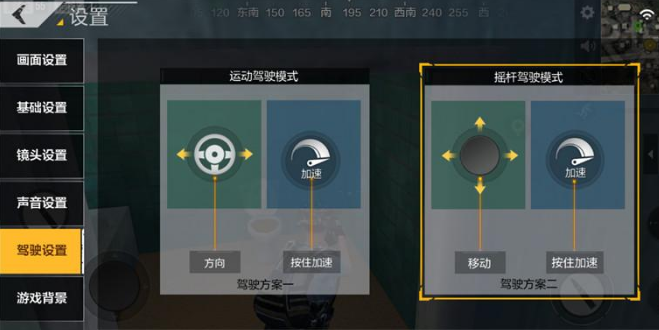 在手游中,有两种开车操作模式,区别不大。只是一个用虚拟摇杆控制方向,另一个加入了倒车按钮而已。