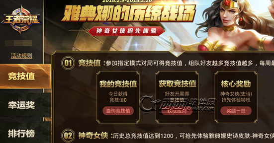 A:竞技值有两种用途:(1)可消耗用于奖池抽奖,抽奖1次消耗80竞技值;(2)历史总竞技值达到1200,可领取雅典娜神奇女侠史诗皮肤体验卡14天。