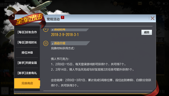 2、2月14日,情人节当天完成与好友双排2次任务可额外获得1个。