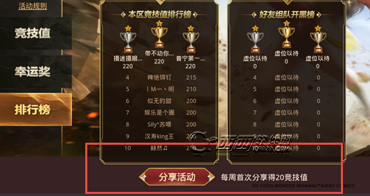 点击“分享活动”按钮,根据提示分享活动给好友即可获得20竞技值奖励(计入周竞技值上限)。