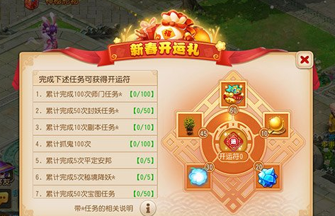 完成指定的任务然后就可以获得开运符,开运符奖励包括修炼果、宝石、仙气、坐骑纹饰等等,需要足够的开运符来解锁,以下是部分的任务要求: