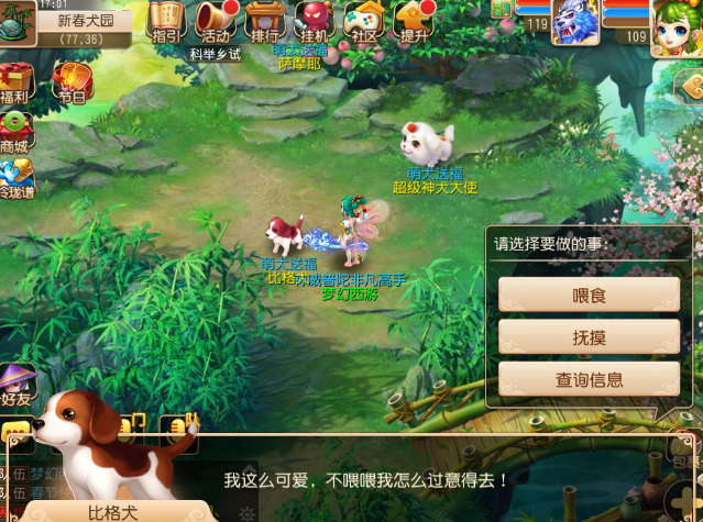 活动期间开发放新春犬园,里面有各种萌犬,包括萨摩耶、比格犬等等,玩家可以自己选择喜欢的萌犬进行喂食、抚摸,增加和蒙圈的亲密度,然后从除夕到初六每天10:00——24:00每个小时都会有一直超级神犬赠送(所有服务器只送一个),获得萌犬应该和亲密度有关系,猜测是全服亲密度最高的那个玩家可以获得萌犬。