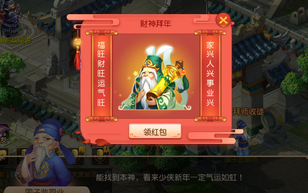 第三、如果开红包没有获得请神符,玩家也可以去当天的财神NPC处用仙玉购买鸿运请神符(和红包开出来的请神符有差别),这两种请神符都可以召唤财神到家园里,只要集齐9个新春祝福就可以拿到奖励了。