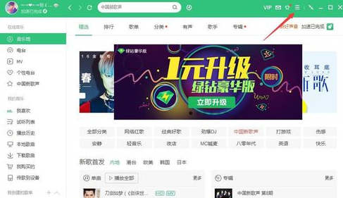 3.我们来到QQ音乐的首页之后,我们就可以找到QQ音乐首页的右上角,有一个三条横杠,我们直接点开那三条横杠即可,然后,我们在进行下一步。