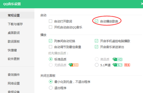 5.我们来到设置页面以后,就可以看到自动播放歌曲的选项了,然后点击确认,我们再次打开QQ音乐就可以进行自动播放音乐了。