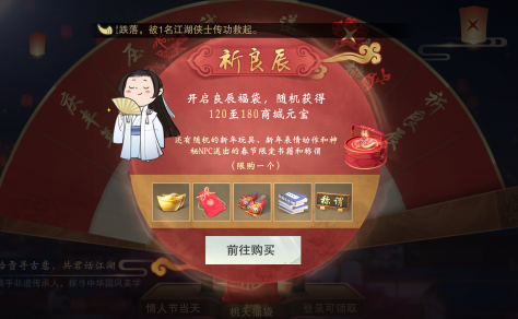 活动内容:春节活动期间,新春特卖商城将上架良辰福袋。少侠可花费100元宝购买,可随机获得120-180元宝、一份随机的新年玩具、一份随机的新年表情动作和一位神秘NPC送出的春节限定纪念书籍或NPC称谓。整个活动期间仅可购买一份。