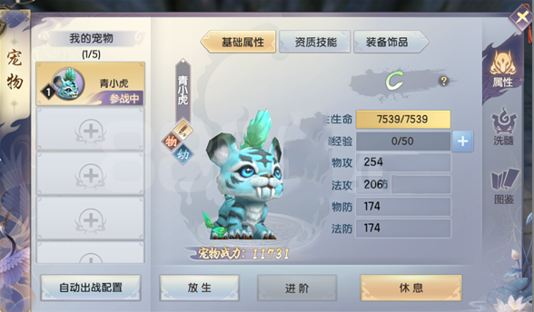 宠物类型:一共分为【宝宝】【变异】【珍兽】【神兽】也就是普通宠物和特殊宠物